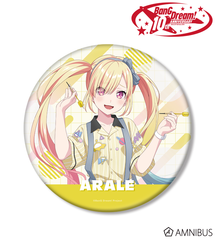 『BanG Dream!』×「ROUND1」のコラボレーションアイテム「描き下ろし 仲町 あられ ボウリングシャツver. BIG缶バッジ」の登場です。