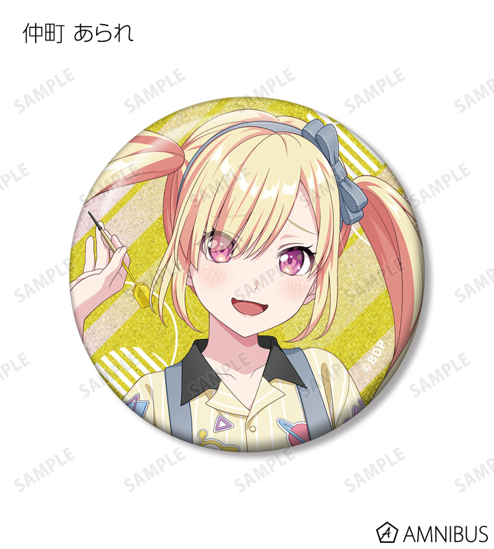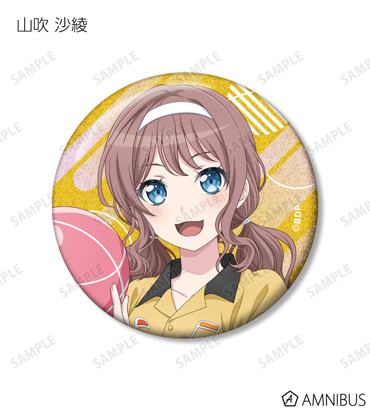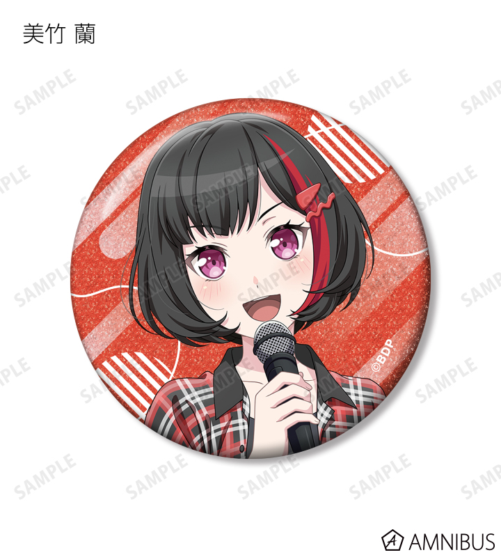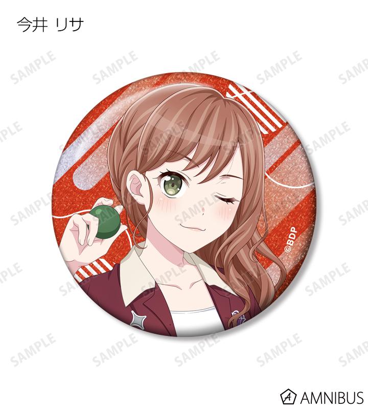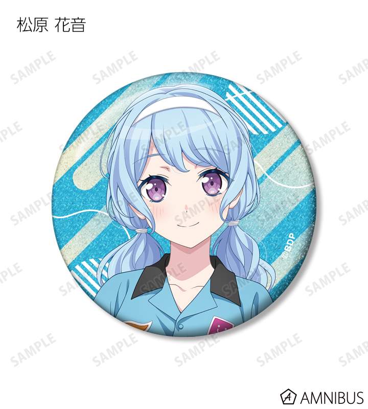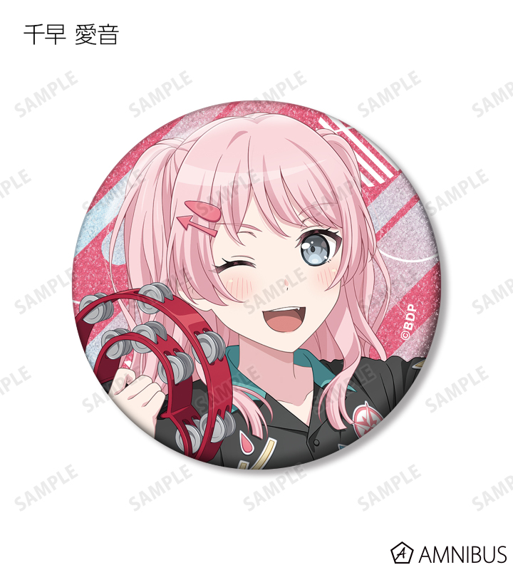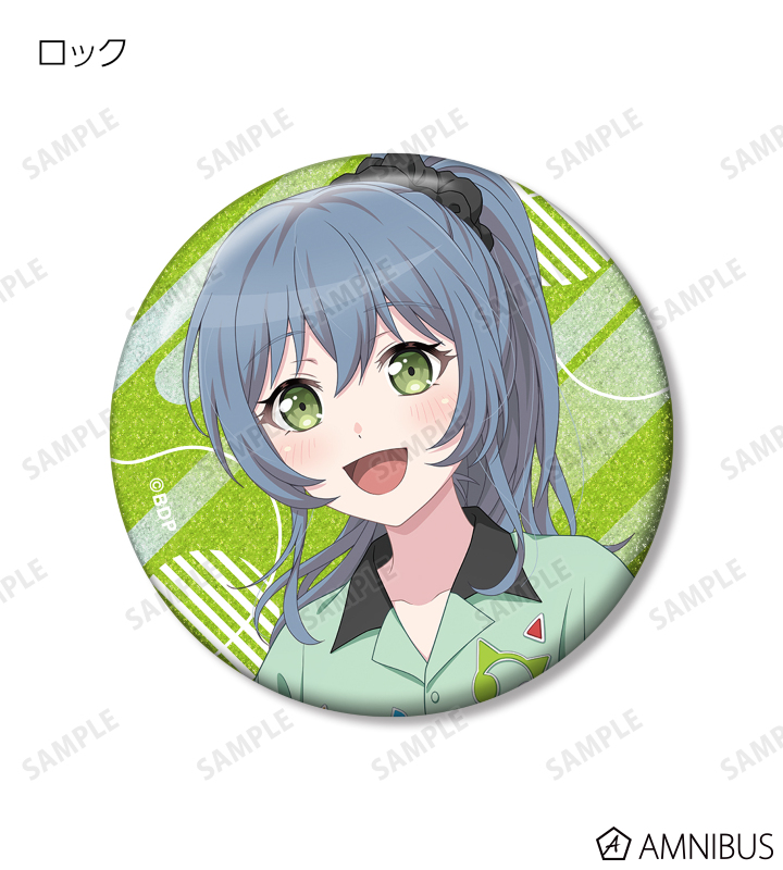 山吹 沙綾、美竹 蘭、大和 麻弥、今井 リサ、松原 花音、桐ヶ谷 透子、ロック、千早 愛音、アモーリス、仲町 あられの描き下ろしイラストをグリッター加工を施した缶バッジに仕上げました。