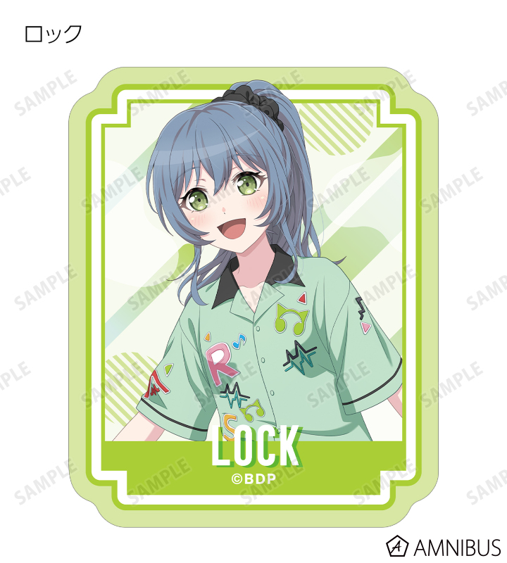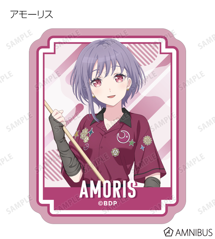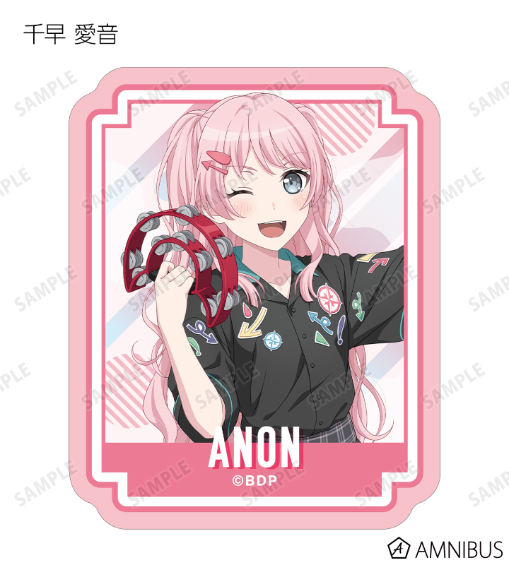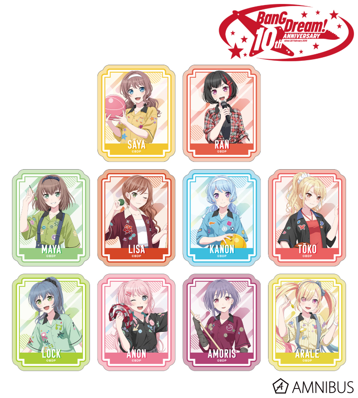 山吹 沙綾、美竹 蘭、大和 麻弥、今井 リサ、松原 花音、桐ヶ谷 透子、ロック、千早 愛音、アモーリス、仲町 あられの描き下ろしイラストをダイカットのステッカーに仕上げました。