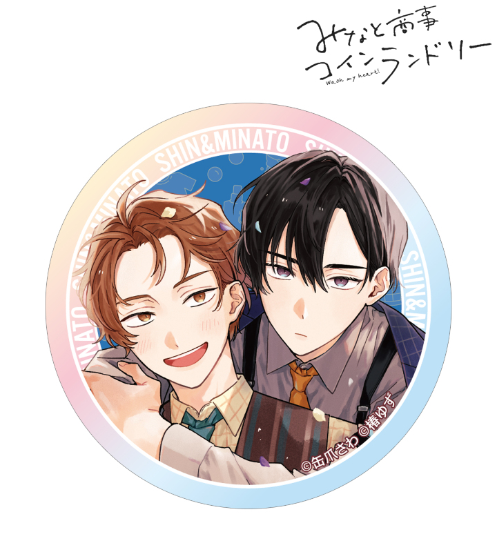 湊 晃、香月 慎太郎のカラーイラスト、ランドリー店をイメージしたモチーフをオーロラステッカーに仕上げました。