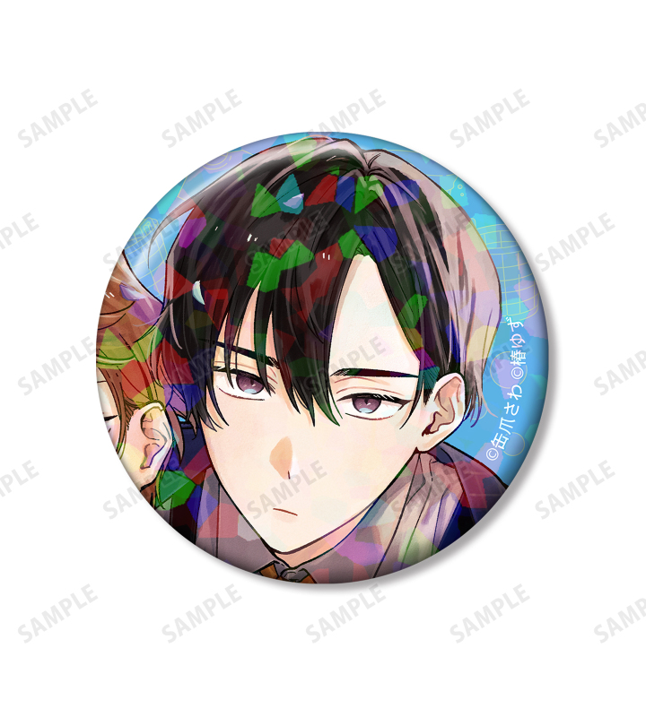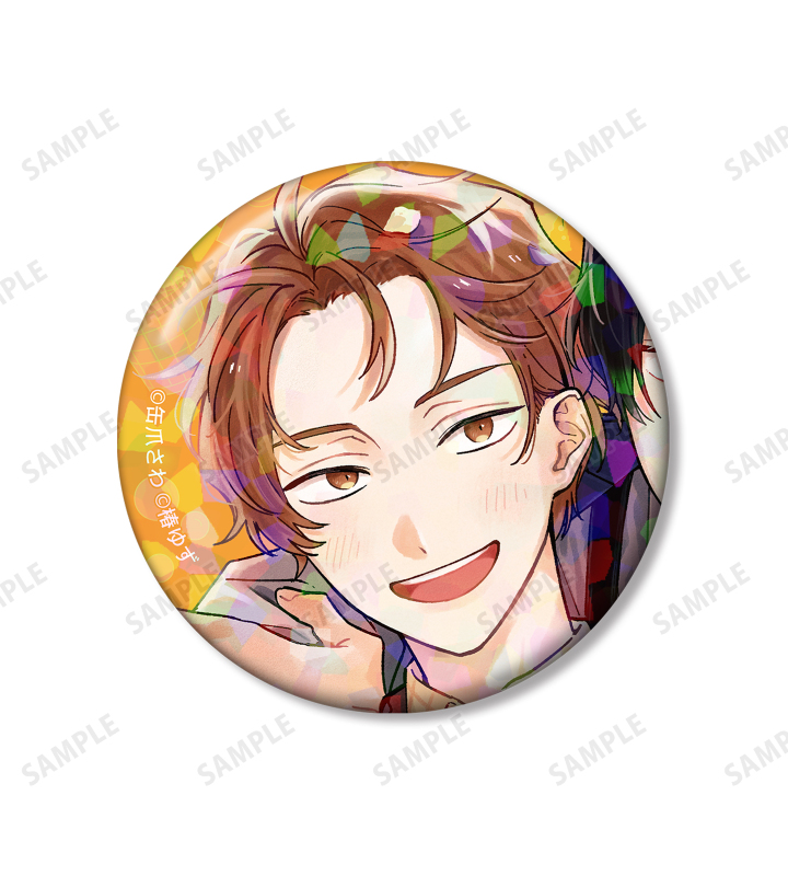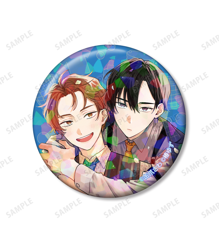 湊 晃、香月 慎太郎のカラーイラスト、ランドリー店をイメージしたモチーフをホログラム加工を施した缶バッジ3個セットに仕上げました。