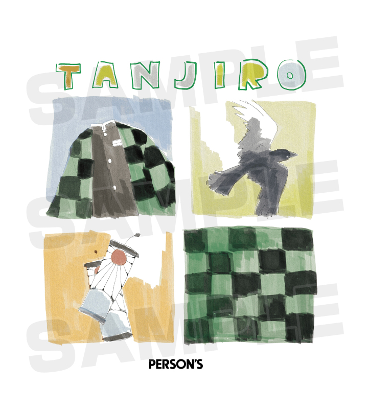 竈門炭治郎の隊服と羽織、鎹鴉、耳飾り、羽織の柄をPERSON'Sらしさのあるタッチで表現し、フロント部分にレイアウトしました。