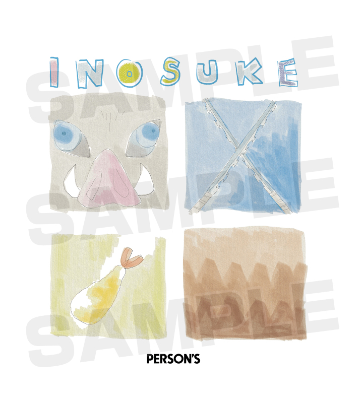 嘴平伊之助の猪の顔、日輪刀、天ぷら、腰の毛皮をPERSON'Sらしさのあるタッチで表現し、フロント部分にレイアウトしました。
