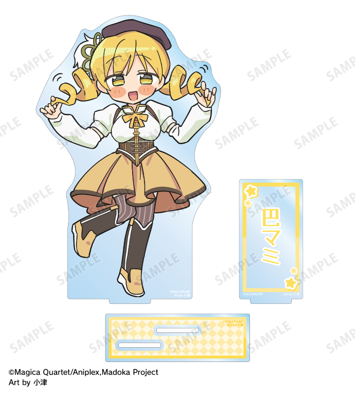 小津さん描き起こしちびキャライラストの巴マミをメインにデザインし、パーツ付きのBIGなアクリルスタンドに仕上げました。