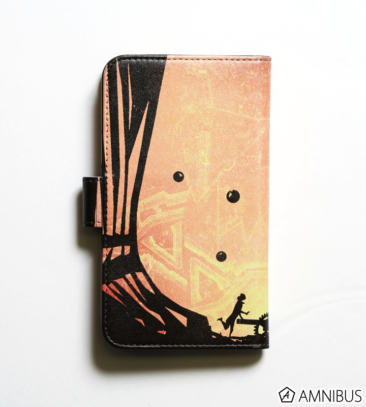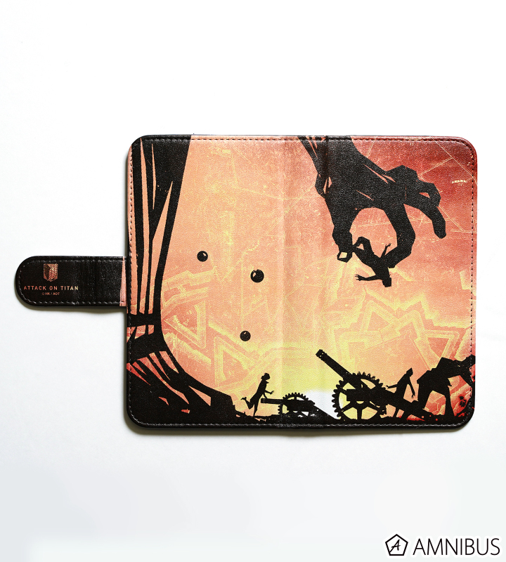 巨人が人間を襲うシーンを大胆に配置した手帳型スマホケース。