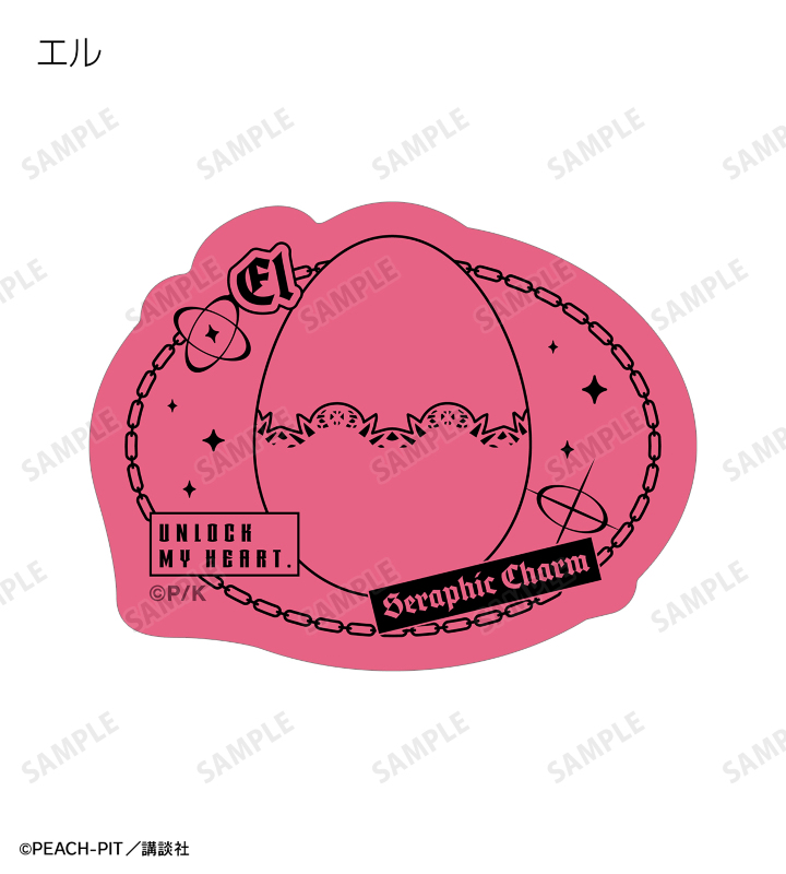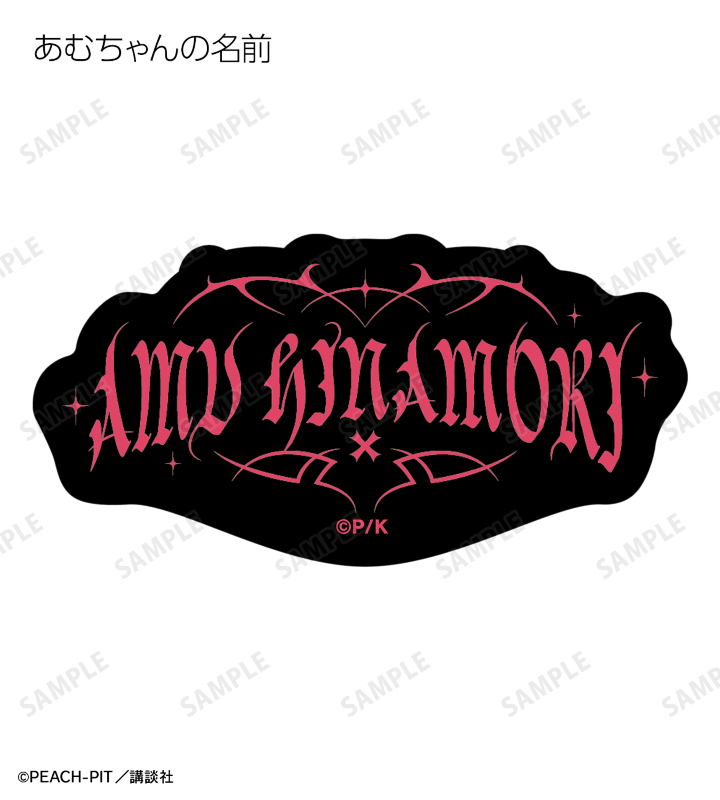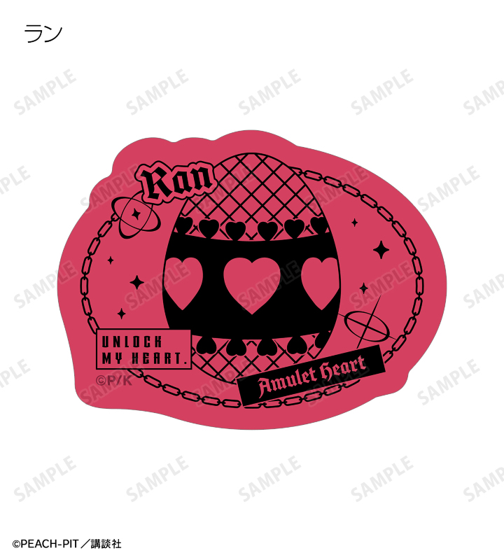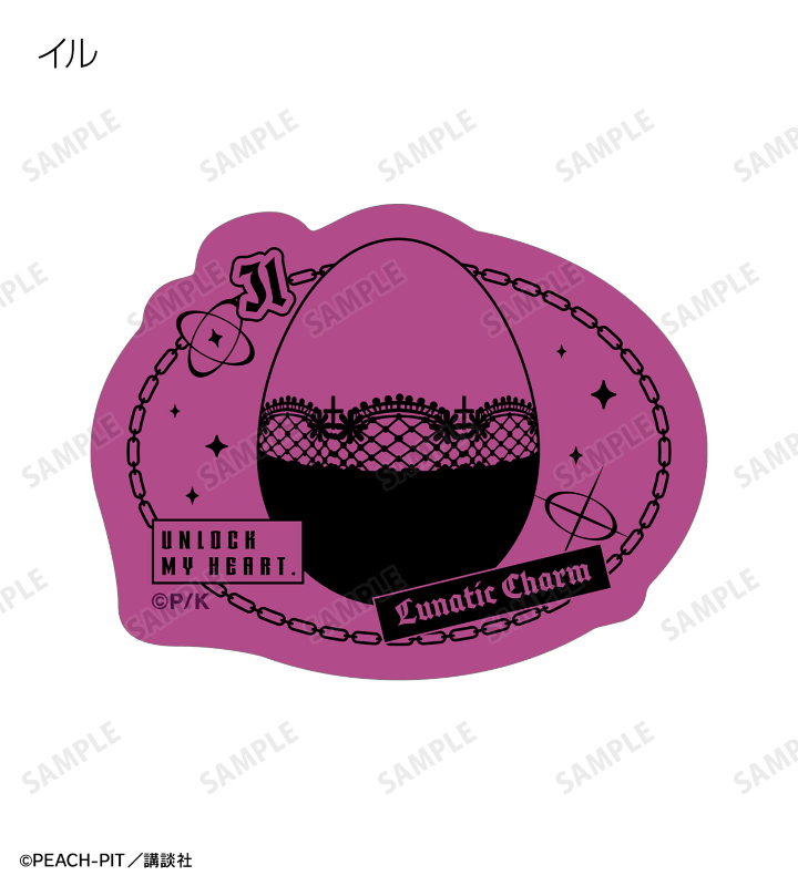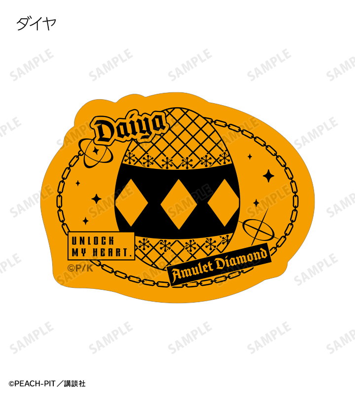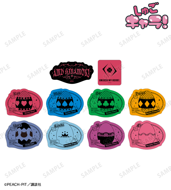 日奈森 あむの名前、「UNLOCK MY HEART」のイメージマーク、ラン、ミキ、スゥ、ダイヤ、ヨル、キセキ、イル、エルのしゅごたまのモチーフをフレークシールに仕上げました。