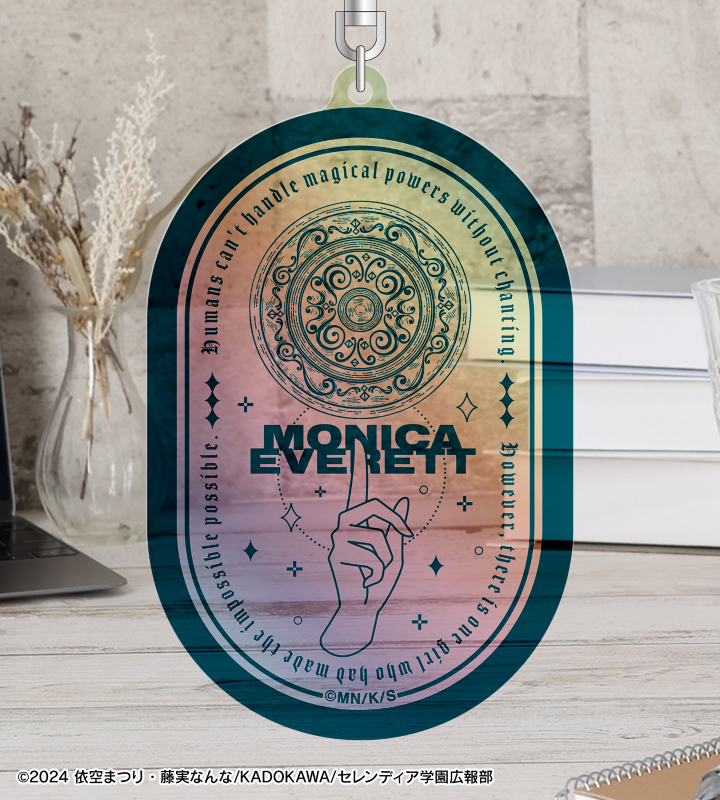 モニカ・エヴァレットの魔法陣と、魔法を発動する時の手をモチーフにデザインし、アクリルキーホルダーに仕上げました。