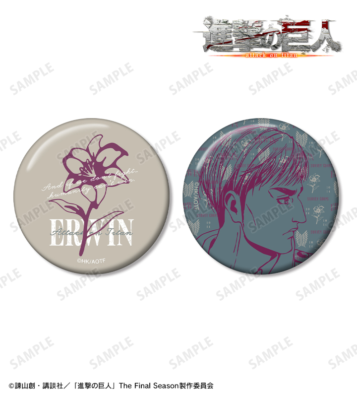 TVアニメ『進撃の巨人』から日常で使える統一感をテーマにしたデザインシリーズ「ar-Unity」のアイテム「エルヴィン ar-Unity 缶バッジ2個セット」の登場です。
