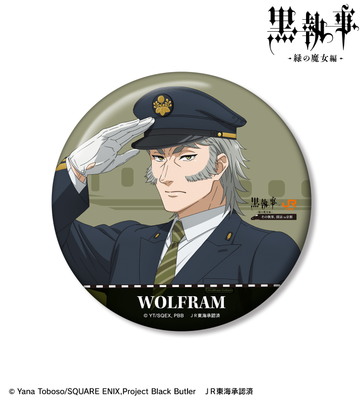 アニメ『黒執事 -緑の魔女編-』×「推し旅/JR東海」のコラボレーションアイテム「描き下ろし ヴォルフラム 駅員ver. 100mm缶バッジ」の登場です。