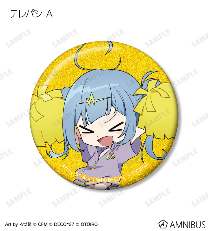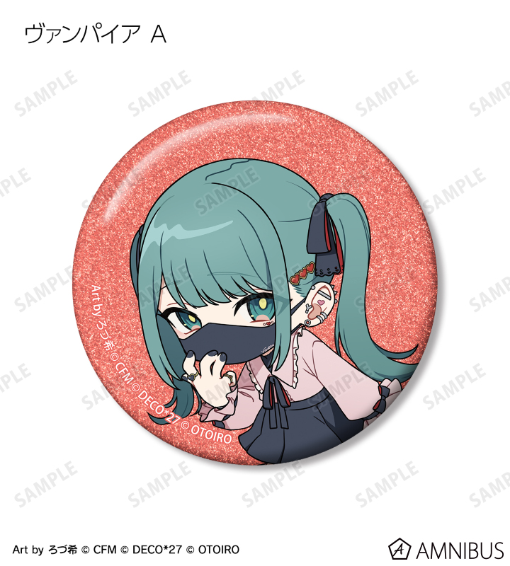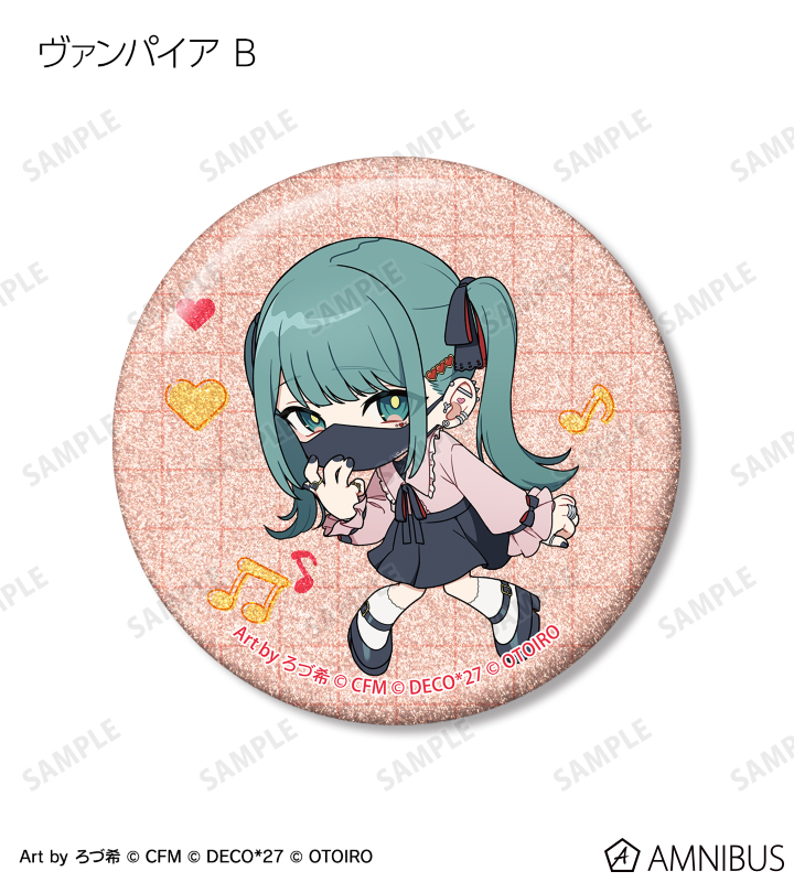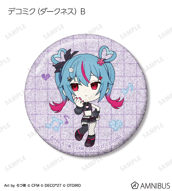 ろづ希さん描き下ろしのデコミク (ライトネス)、デコミク (ダークネス)、テレパシ、モニタリング、ラビットホール、ヴァンパイアのちびキャライラストをメインにデザインし、グリッター加工を施した缶バッジに仕上げました。