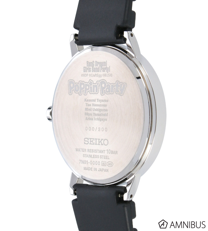 シリアルナンバー、「Poppin'Party」のバンドロゴ、セイコーのブランドロゴを裏ぶたに刻印しています。