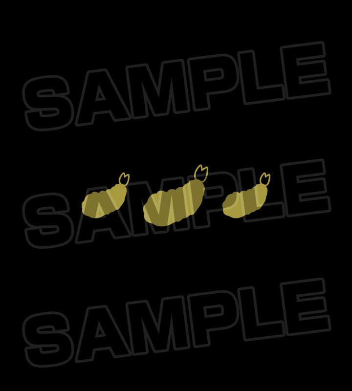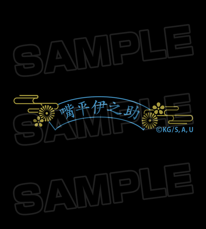 嘴平伊之助の名前や和風のモチーフを組み合わせたデザインと、天ぷらを黒の軸部分にプリントしています。