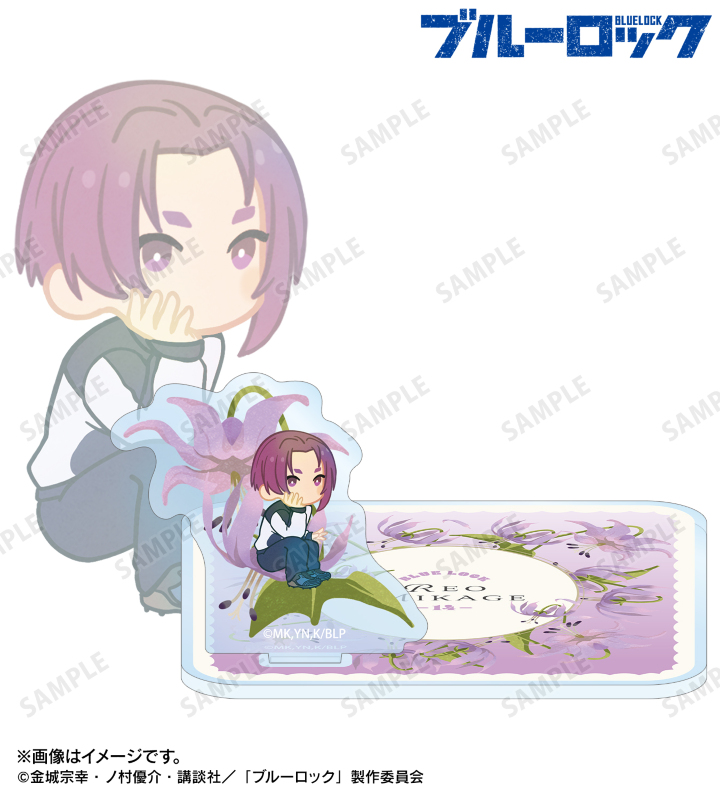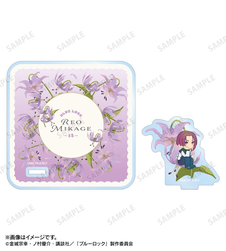 御影 玲王のイラスト、各キャラクターをイメージした花をボタニカルデザインに落とし込んで繊細なタッチで新たに描き起こし、アクリルスタンド付きコースターに仕上げました。