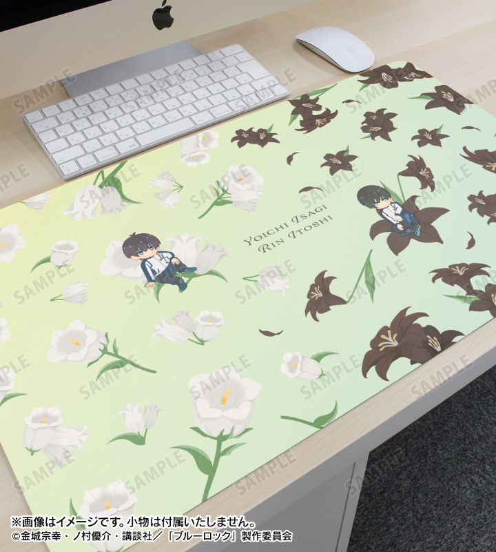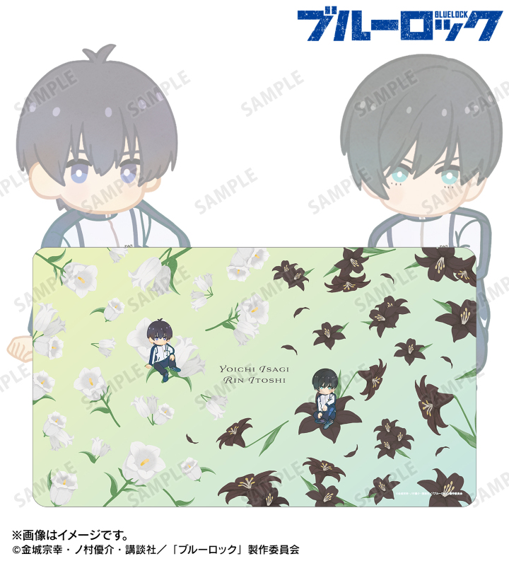 潔 世一、糸師 凛のイラスト、各キャラクターをイメージした花をボタニカルデザインに落とし込んで繊細なタッチで新たに描き起こし、マルチデスクマットに仕上げました。