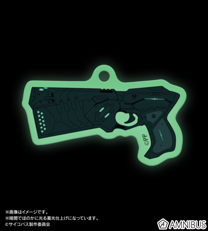 ドミネーターの描き起こしモチーフを暗所で発光する蓄光のアクリルにデザインしてアクリルキーホルダーに仕上げました。