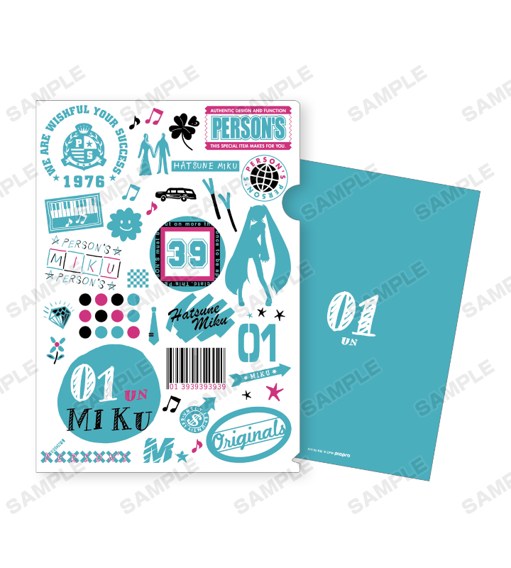 初音ミクたち『ピアプロキャラクターズ』×「PERSON’S」のコラボレーションアイテム「PERSON'Sコラボ 初音ミク クリアファイル」の登場です。 PERSON’Sは、「明るく、元気に、健康的」の基本コンセプトのもと、派手なカラーや楽しいイラストが特徴的な商品を多数展開するブランドです。 初音ミクとPERSON'Sのアーカイブにそったテイストをかけ合わせてデザインしました。 反対面には初音ミクのナンバリングをプリントしました。
