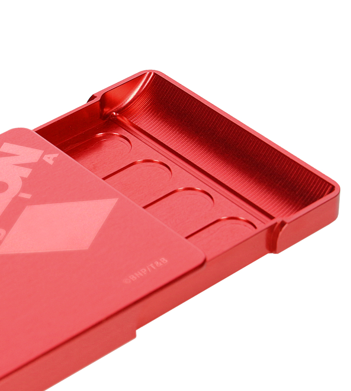 『TIGER & BUNNY』×「GILD design」のコラボレーションアイテム「GILD design(ギルドデザイン) ジュラルミンカードケース バーナビー・ブルックス Jr.カラー」の登場です。 GILD designは「スマートフォンを本気で守る」をコンセプトに、航空機や自動車部品に使用される高強度ジュラルミンの無垢材から削り出したアルミケースを製作するブランドです。 アポロンメディアのロゴマークのプリントを施し、バーナビー・ブルックス Jr.が使用しているようなカードケースをイメージしたデザインに仕上げました。 本体内部機構では、取り出し口の3次元加工によりカードが取り出しやすくなっています。 ジュラルミンから削り出して製作したカードケースで、ビジネスシーンにもマッチするアイテムです。