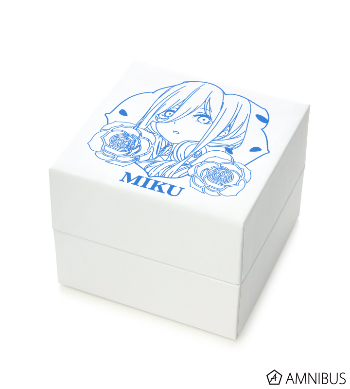 BOX表面に三玖のイラストをレイアウトし、BOXを収納するスリーブケースには作品ロゴとINDEPENDENTのブランドロゴのプリントを施しました。
