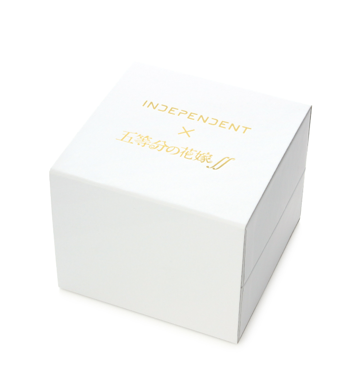 TVアニメ『五等分の花嫁∬』×「INDEPENDENT」のコラボレーション限定モデルの登場です。 INDEPENDENTは、1996年に誕生以来、自由な発想から生み出された独創的なテイスト・デザインを提案し続けるファッションウオッチブランドです。 五つ子の可愛らしさと普段使いを兼ね備えたデザインに仕上げました。 錆びにくく高級感があり、使い勝手もよいステンレスのバンドを採用しています。 BOX表面に三玖のイラストをレイアウトし、BOXを収納するスリーブケースには作品ロゴとINDEPENDENTのブランドロゴのプリントを施しました。 シリアルナンバー、作品ロゴ、INDEPENDENTのブランドロゴを裏ぶたに刻印しています。 数量限定200本のコラボウオッチをぜひあなたのコレクションに加えてみてください。 ※シリアルナンバーはお選び頂けません。 保証について 仕様 材質 サイズ