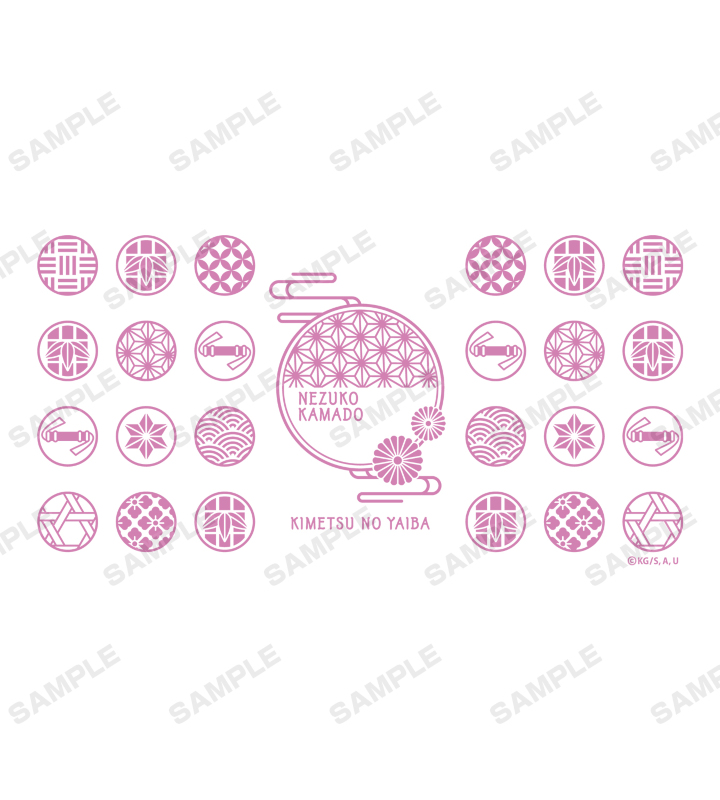 竈門禰󠄀豆子の着物の柄、口に咥えた竹筒、藤の花などを和風のモチーフと合わせてレイアウトしたデザインに仕上げています。