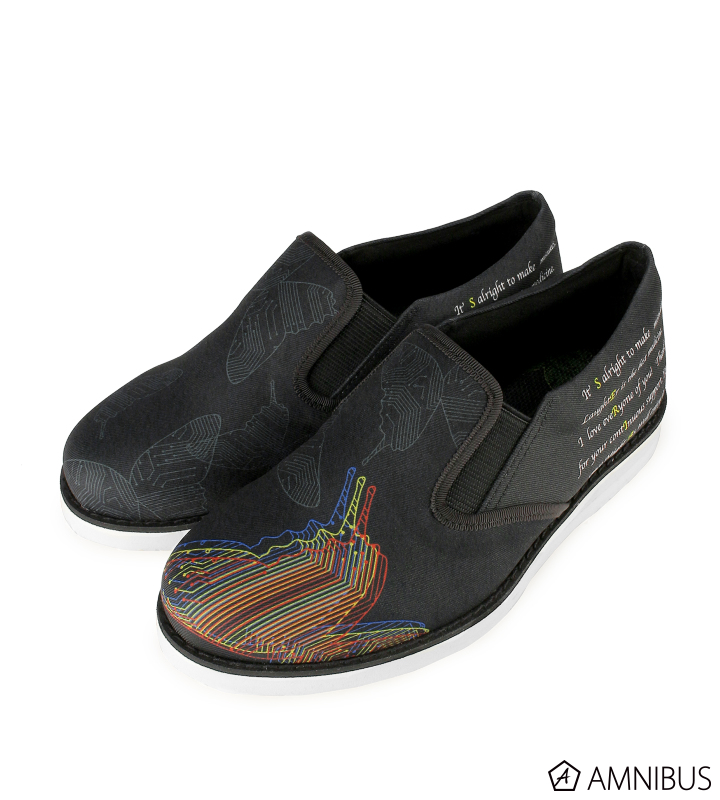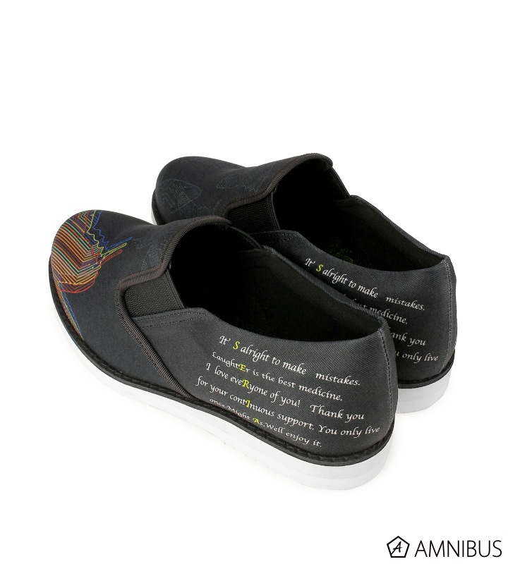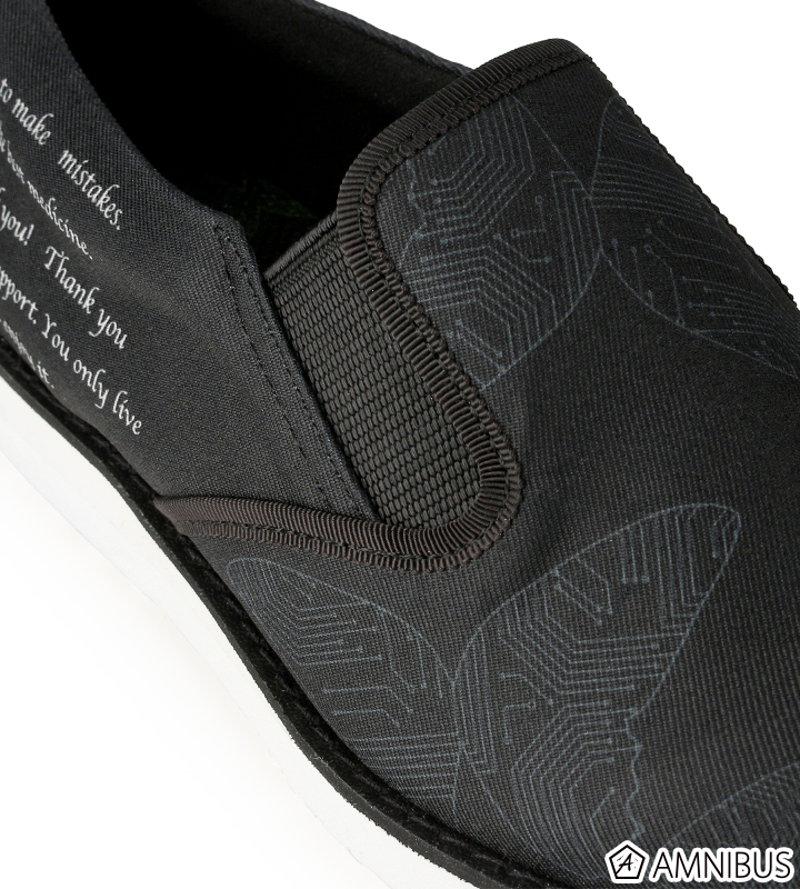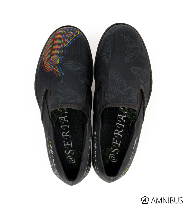 深川さんからいただいたデザインをもとに、スリッポンとナイロンバッグを制作しました。