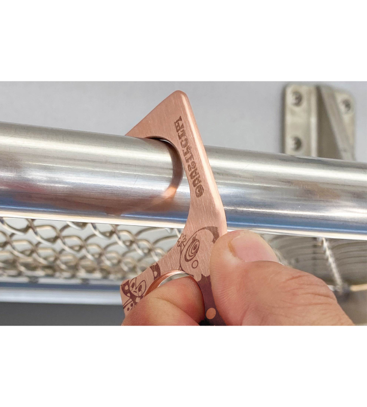 多くの電車、バスで採用されている直径32mmまでのパイプに掛けられるよう設計となっており、直接手で触る製品のため、安全性を確保した滑らかな曲面のヘアライン加工を施しています。
