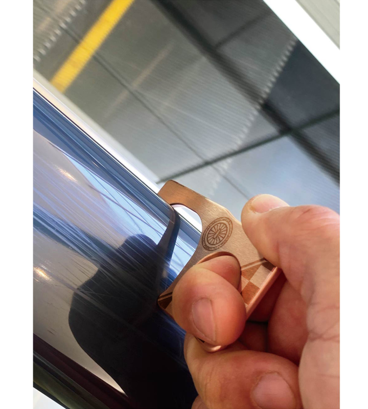 多くの電車、バスで採用されている直径32mmまでのパイプに掛けられるよう設計となっており、直接手で触る製品のため、安全性を確保した滑らかな曲面のヘアライン加工を施しています。