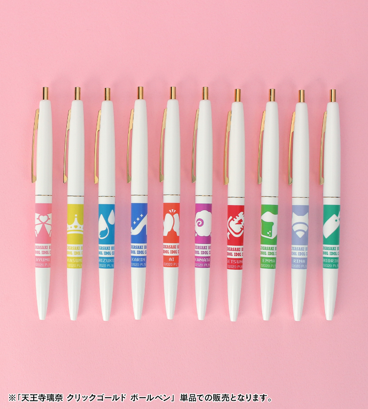 『ラブライブ!虹ヶ咲学園スクールアイドル同好会』から「BIC」のアイテム「天王寺璃奈 クリックゴールド ボールペン」の登場です。 クリックゴールドは、高級感のあるゴールドのクリップとリングが特長のノック式ボールペンです。 天王寺璃奈をイメージしたモチーフや作品タイトル、名前をレイアウトし、メンバーからイメージしたカラーリングで仕上げたデザインを軸部分にプリントを施しました。 コンパクトなサイズ感でボディが軽く、様々なシーンでご使用いただけるアイテムです。