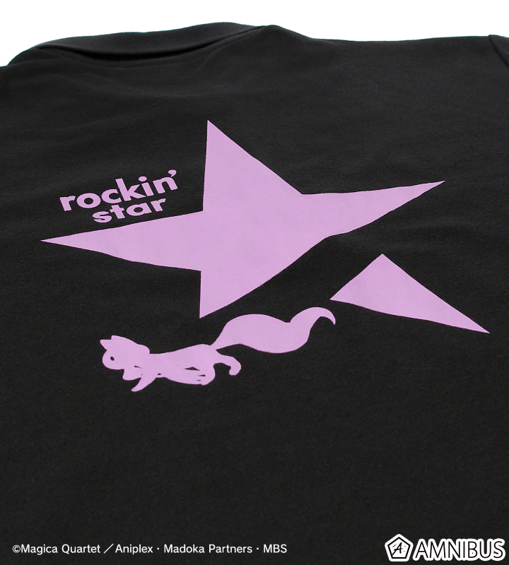 背面には大きくロッキンスターとのコラボロゴをプリントし、胸元にはキュゥべえのシルエットを刺繍で施しています。