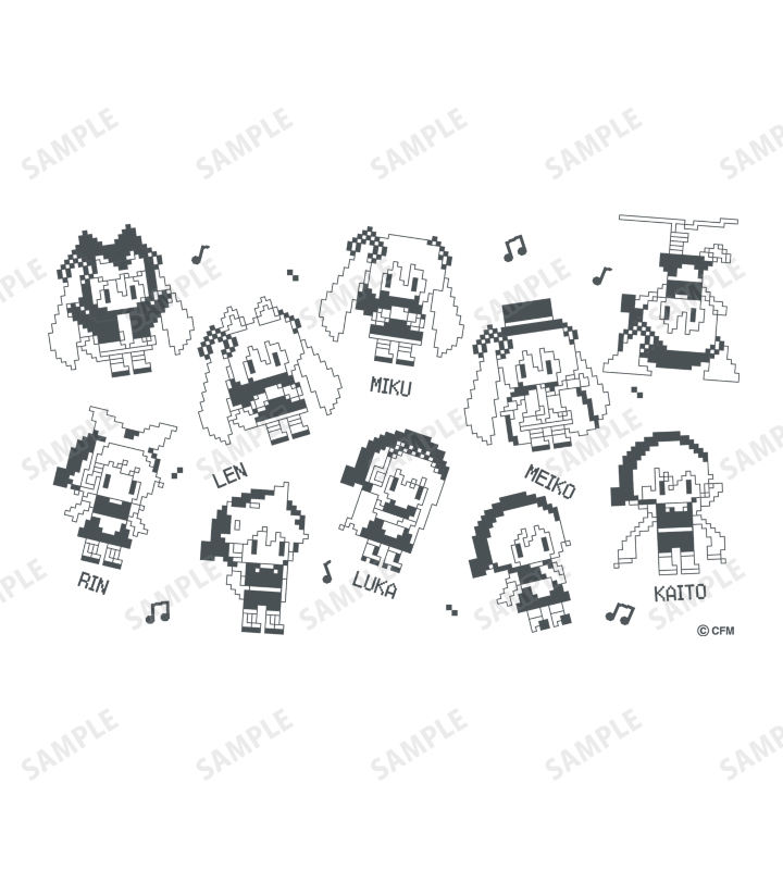 初音ミク、鏡音リン、鏡音レン、巡音ルカ、MEIKO、KAITOをドット絵風に描き起こしたイラストをメインにデザインしました。
