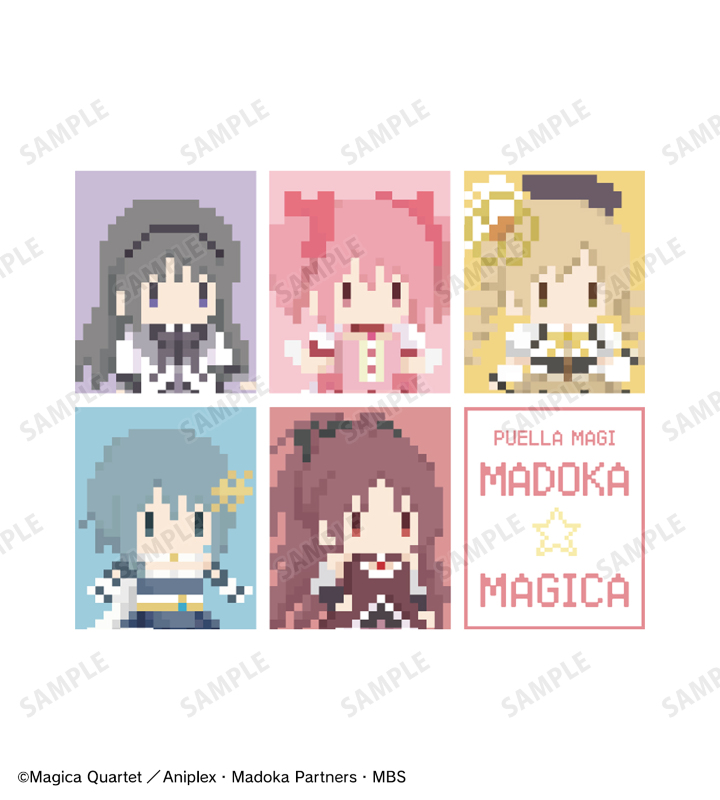 鹿目まどか、暁美ほむら、巴マミ、美樹さやか、佐倉杏子のドット絵風のイラストをメインにデザインしました。
