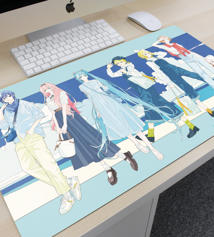 かとうれい先生描き下ろしイラストの初音ミク、鏡音リン、鏡音レン、巡音ルカ、MEIKO、KAITOをプレイマットに仕上げました。