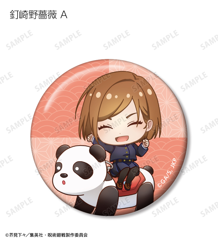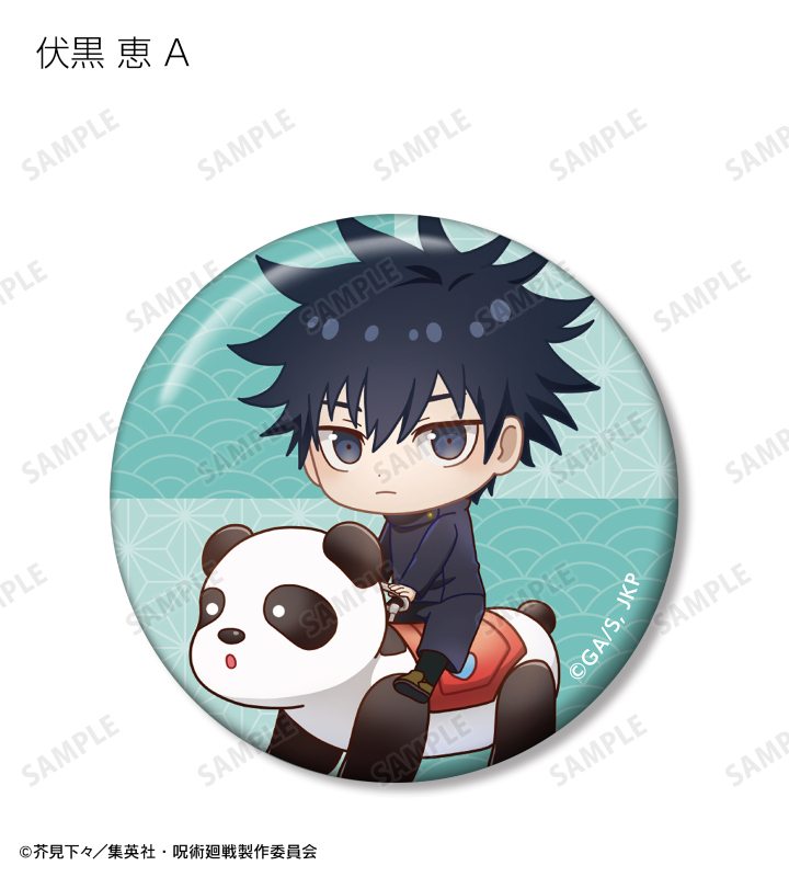 虎杖悠仁、伏黒 恵、釘崎野薔薇、禪院真希、狗巻 棘、パンダの描き起こしちびキャライラストを缶バッジに仕上げました。