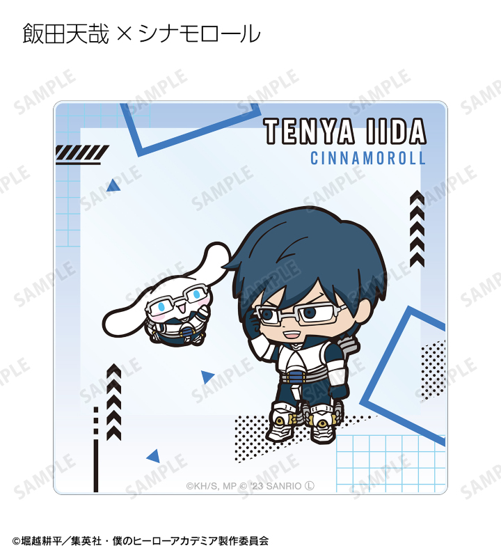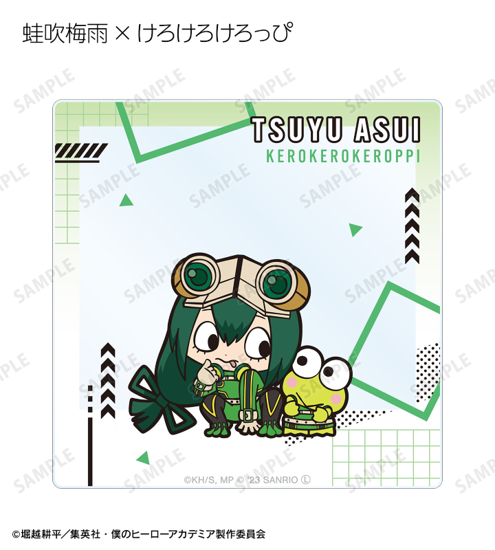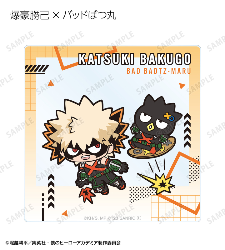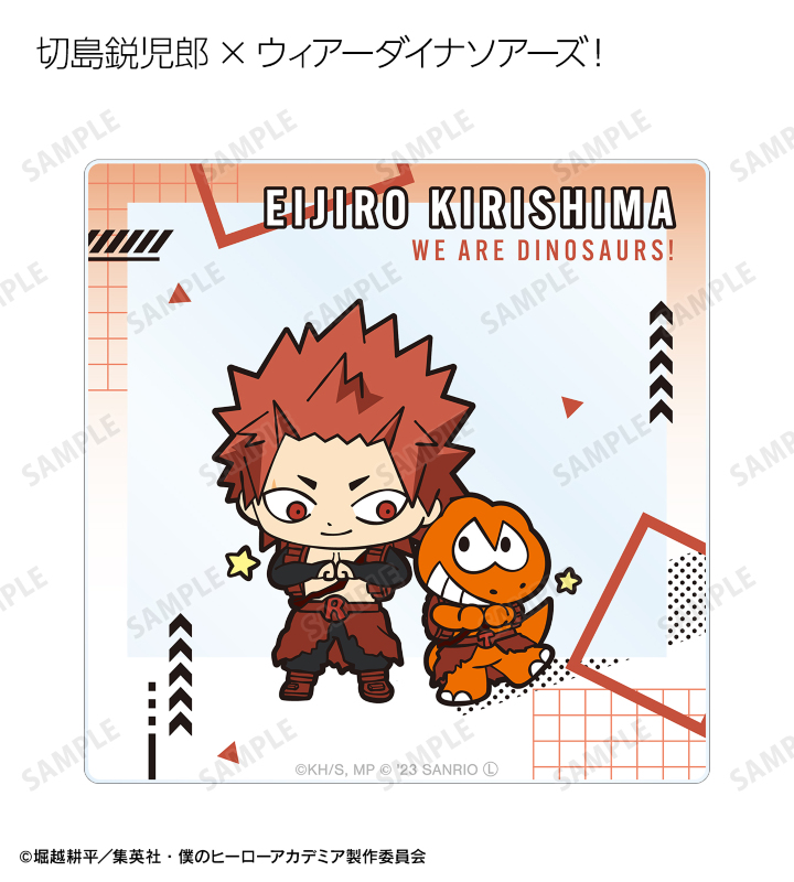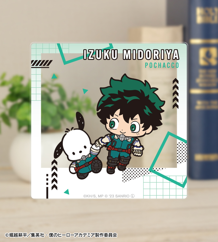 緑谷出久×ポチャッコ、爆豪勝己×バッドばつ丸、麗日お茶子×マイメロディ、飯田天哉×シナモロール、轟焦凍×タキシードサム、蛙吹梅雨×けろけろけろっぴ、切島鋭児郎×ウィアーダイナソアーズ!のビジュアルをアクリルカードに仕上げました。
