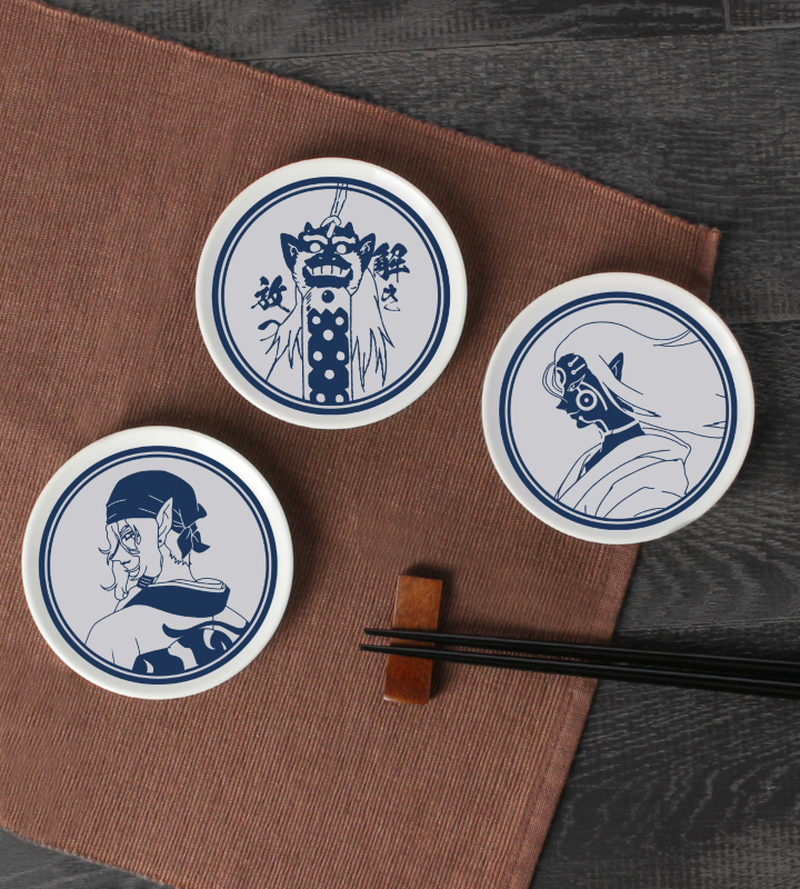 薬売り、退魔の剣、薬売り(ハイパーver.)のイラストを豆皿に仕上げました。