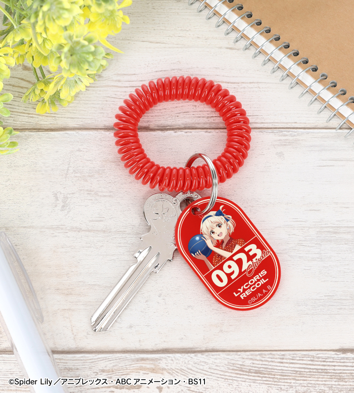 錦木千束の描き下ろしイラスト、誕生日を、ロッカーのキータグをイメージしたアクリルキーホルダーに仕上げました。