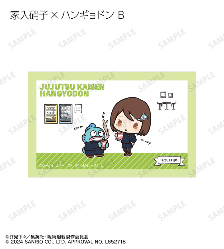 五条 悟×シナモロール、夏油 傑×ルロロマニック、家入硝子×ハンギョドン、七海建人×ポムポムプリン、灰原 雄×コロコロクリリン 、天内理子×こぎみゅん、伏黒甚爾×バッドばつ丸のイラストをイラストカードに仕上げました。