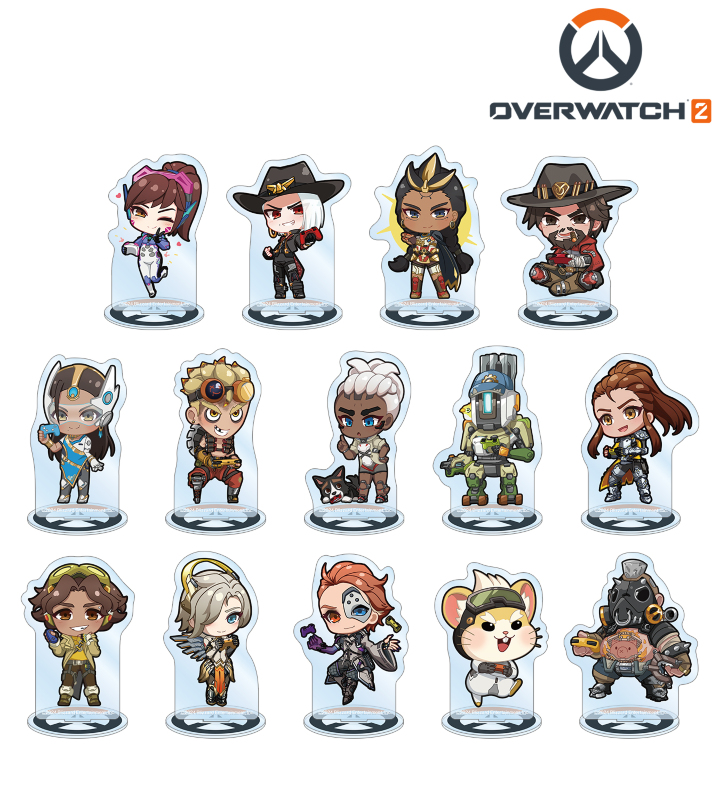 D.Va、アッシュ、イラリー、キャスディ、シンメトラ、ジャンクラット、ソジョーン、バスティオン、ブリギッテ、ベンチャー、マーシー、モイラ、レッキング・ボール、ロードホッグのちびキャライラストをアクリルスタンドに仕上げました。