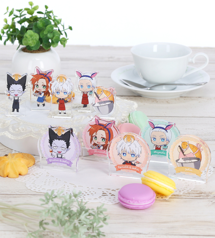 ドラルク、ロナルド、ジョン、ヒナイチ、ヒヨシのミニキャライラストをアクリルマスコットに仕上げました。