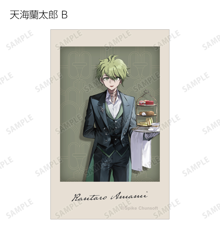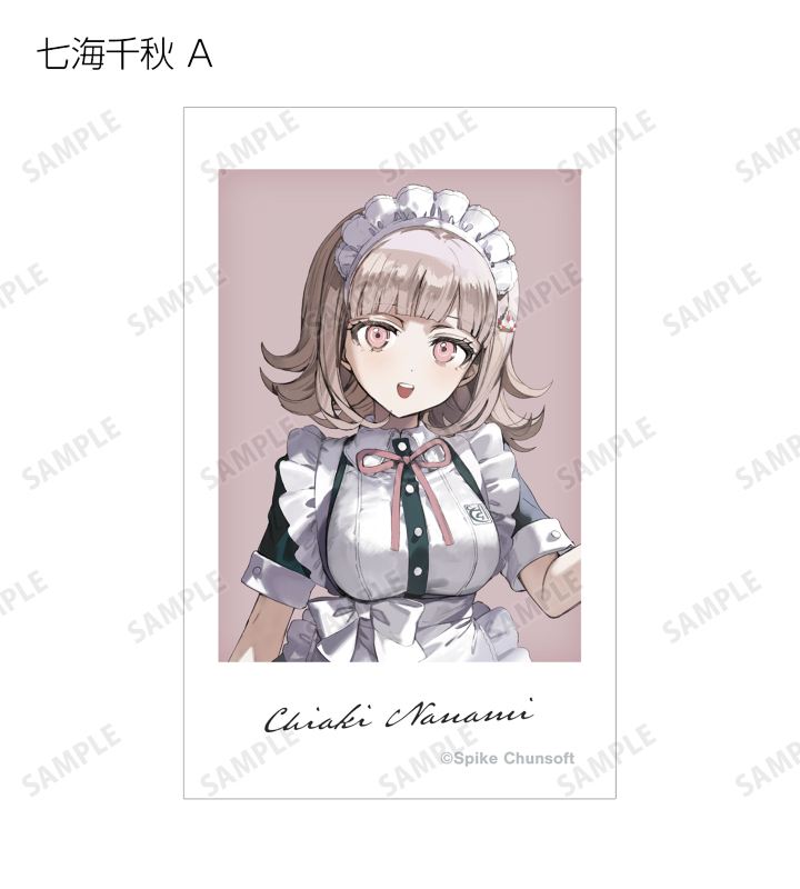 緜先生描き下ろしイラストの苗木誠、霧切響子、セレスティア・ルーデンベルク、江ノ島盾子、日向創、狛枝凪斗、七海千秋、カムクライズル、赤松楓、天海蘭太郎、王馬小吉、最原終一、キャラクターの名前をインスタントカメラ風のイラストカードに仕上げました。