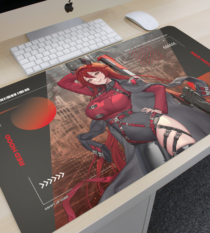 『勝利の女神:NIKKE』×「LOVECACAO」のコラボレーションアイテム「LOVECACAOさんイラスト レッドフード タクティカルファッションver. マルチデスクマット」の登場です。