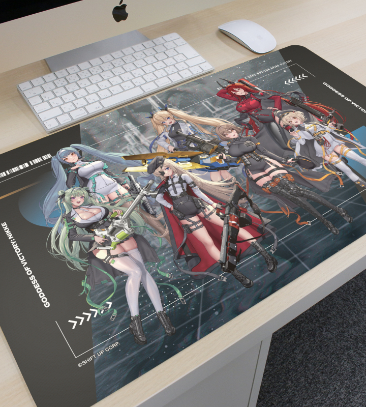 『勝利の女神:NIKKE』×「LOVECACAO」のコラボレーションアイテム「LOVECACAOさんイラスト 集合 タクティカルファッションver. マルチデスクマット」の登場です。