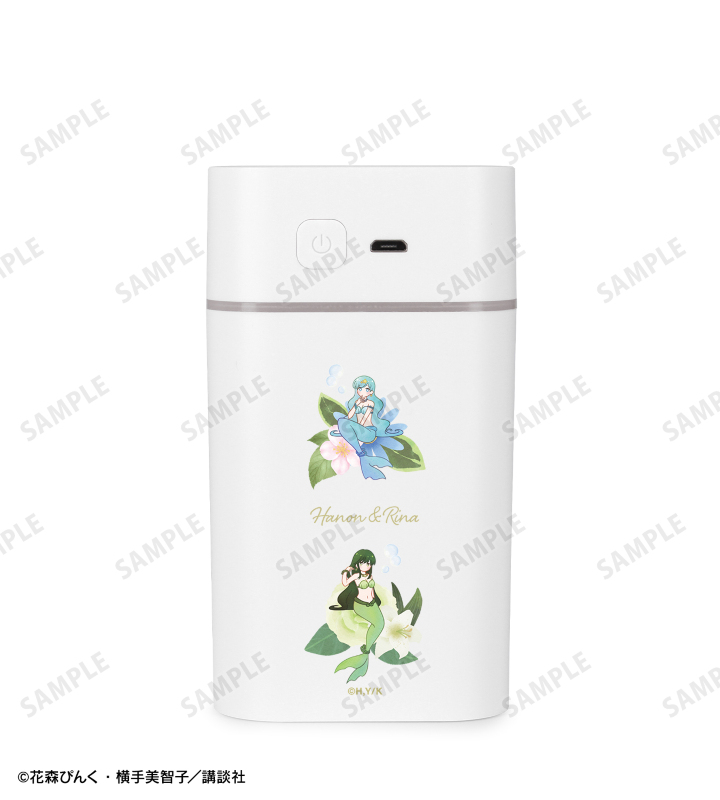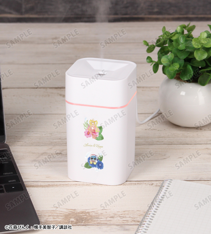 るちあ、波音、リナ、ヒッポのイラストをボタニカルデザインに落とし込んで繊細なタッチで新たに描き起こし、卓上加湿器に仕上げました。