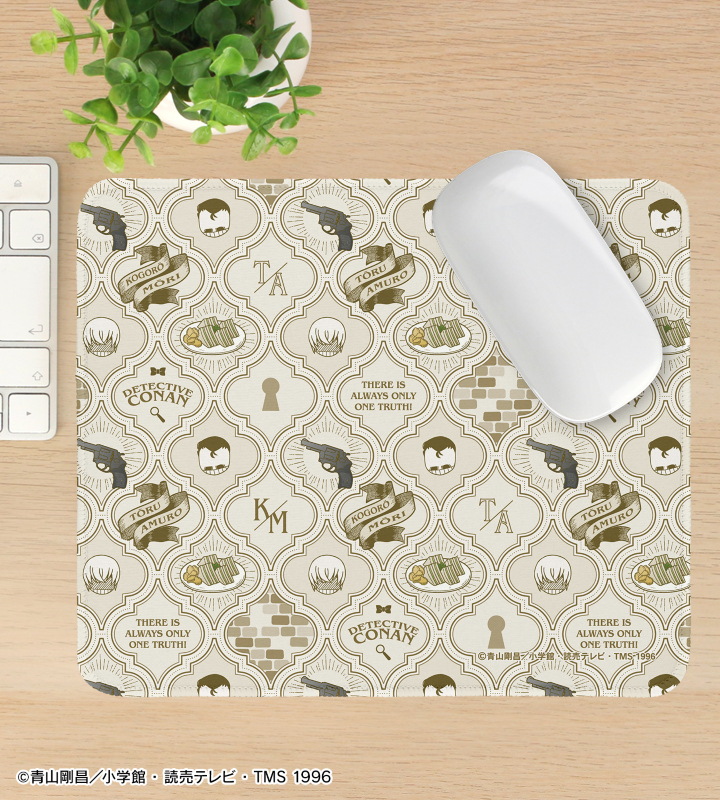 毛利小五郎、安室透をイメージした描き起こしモチーフイラスト、作品名、キャラクターのイニシャルをマウスパッドに仕上げました。