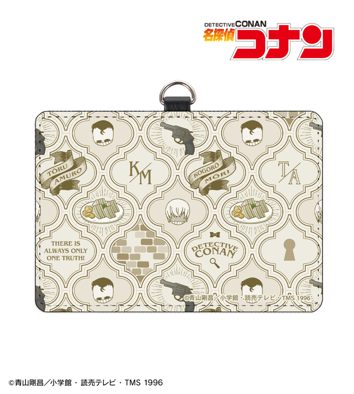 毛利小五郎、安室透をイメージした描き起こしモチーフイラスト、作品名、キャラクターのイニシャルをネックストラップ付きのパスケースに仕上げました。