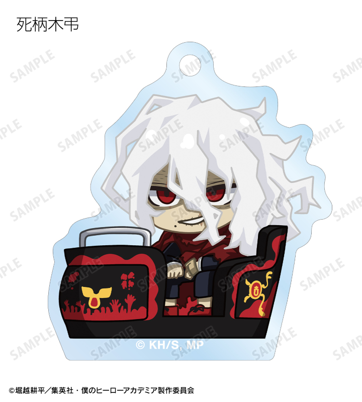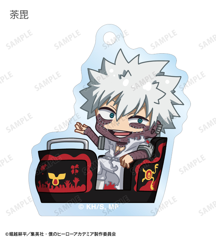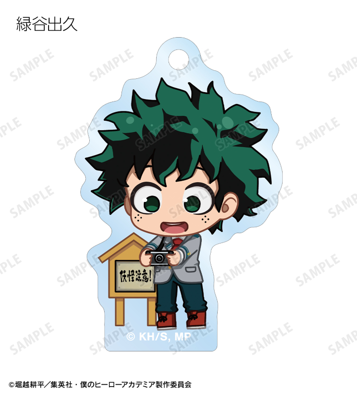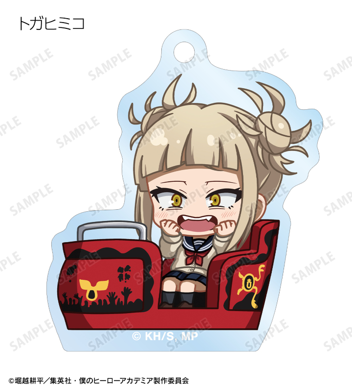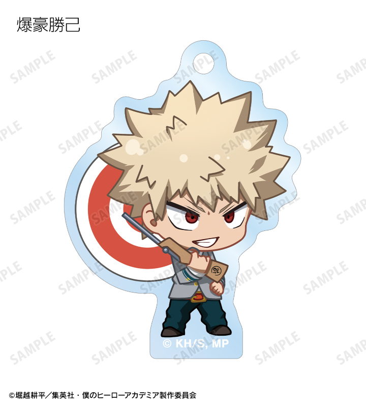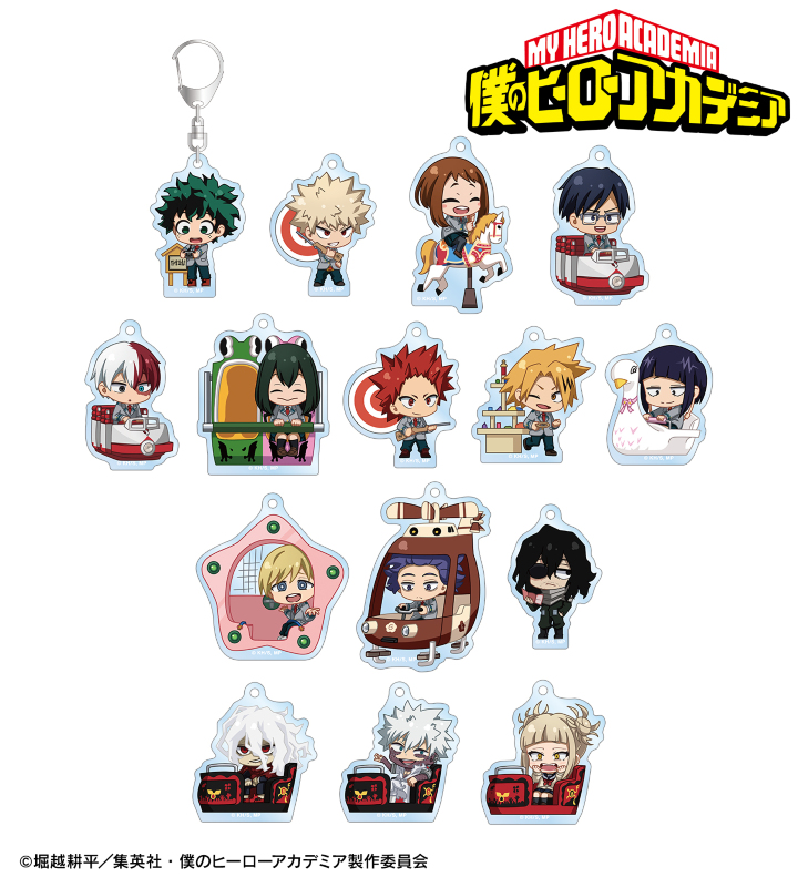 緑谷出久、爆豪勝己、麗日お茶子、飯田天哉、轟焦凍、蛙吹梅雨、切島鋭児郎、上鳴電気、耳郎響香、物間寧人、心操人使、相澤消太、死柄木弔、荼毘、トガヒミコのちびキャラビジュアルをアクリルキーホルダーに仕上げました。