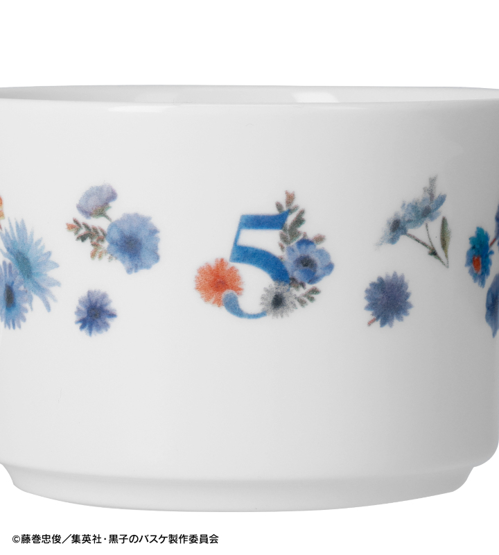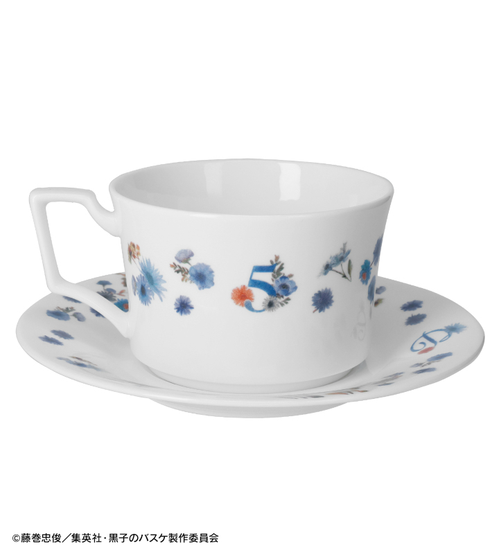カップ、ソーサー全体にキャラクターカラー、相棒のカラーのお花を散りばめ、カップには背番号である5、ソーサーにはイニシャルである"D"を忍ばせています。