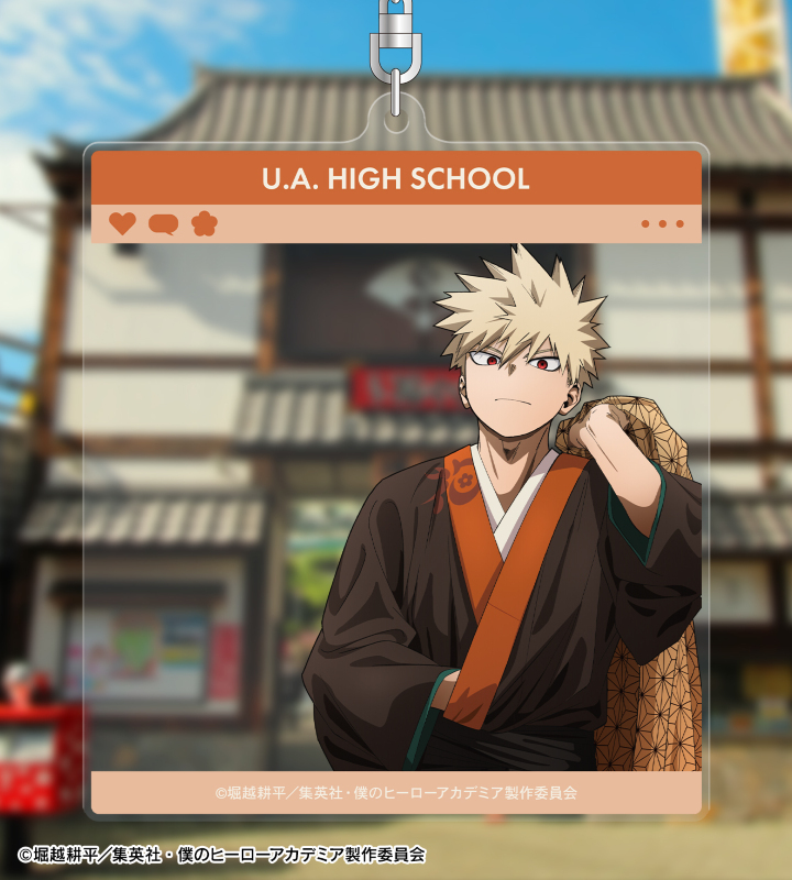 TVアニメ『僕のヒーローアカデミア』×「浅草花やしき」のコラボレーションアイテム「描き下ろし 爆豪勝己 花やしきver. SNS風BIGアクリルキーホルダー」の登場です。