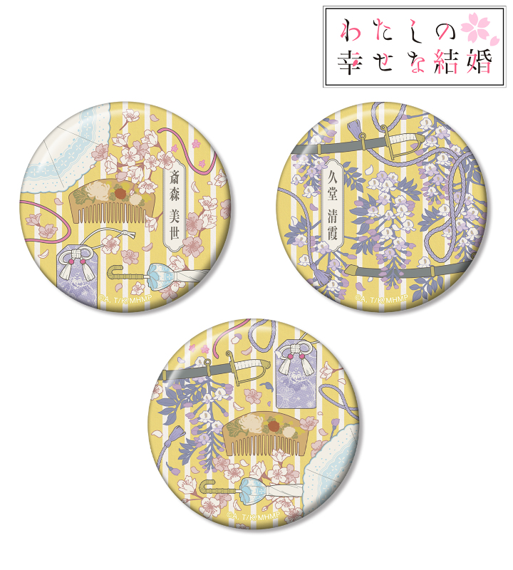 TVアニメ「わたしの幸せな結婚」から日常で使える統一感をテーマにしたデザインシリーズ「ar-Unity」のアイテム「斎森 美世&久堂 清霞 モチーフ柄 缶バッジ3個セット」の登場です。