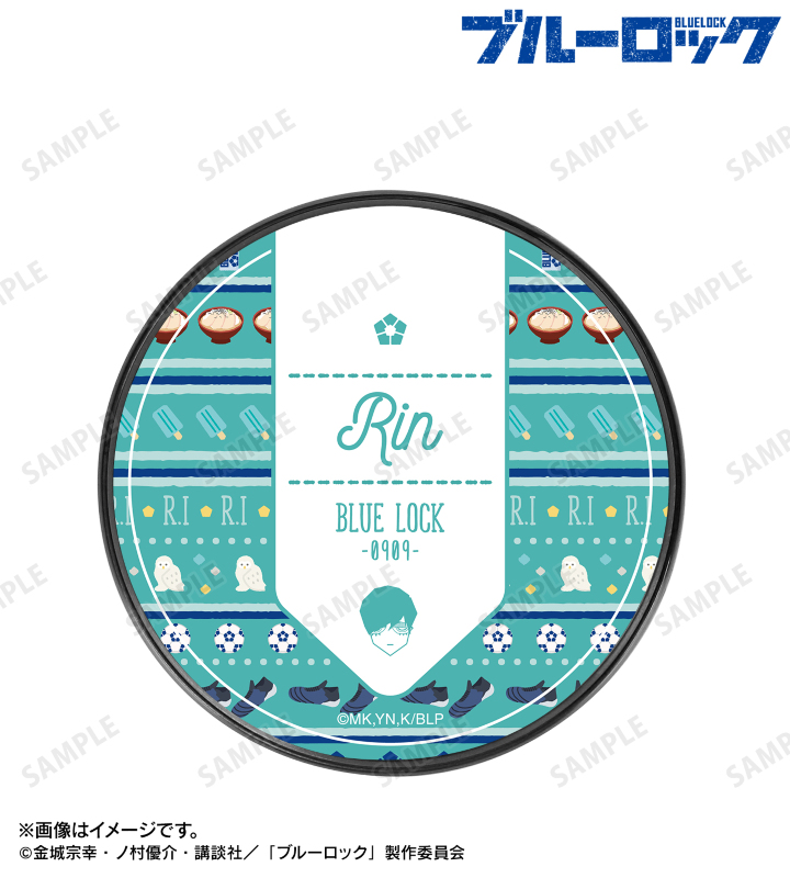 糸師 凛のイラスト、イニシャル、誕生日などのキャラクターや作品のモチーフを描き起こし、総柄デザインのサークル型QI対応充電器に仕上げました。
